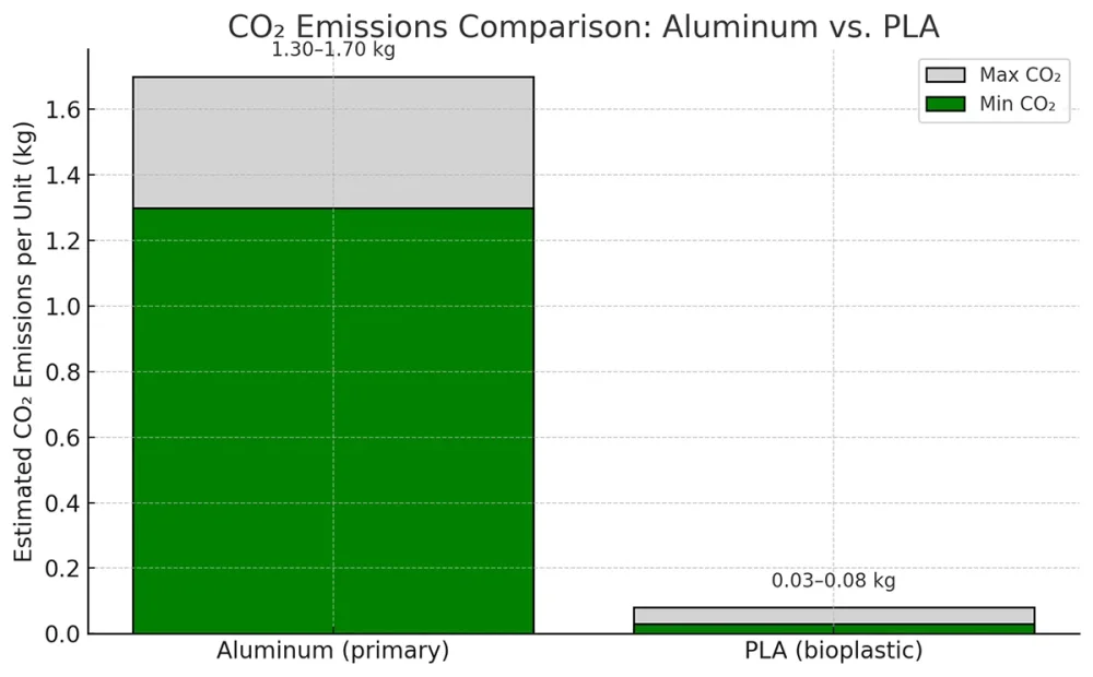 - Recycled aluminum reduces emissions, but still typically higher than PLA.